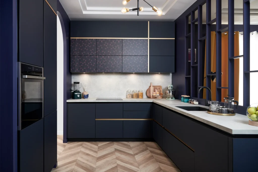A bold, contemporary kitchen design featuring deep navy cabinetry and subtle brass detailing, creating a refined space that feels both luxurious and highly functional.